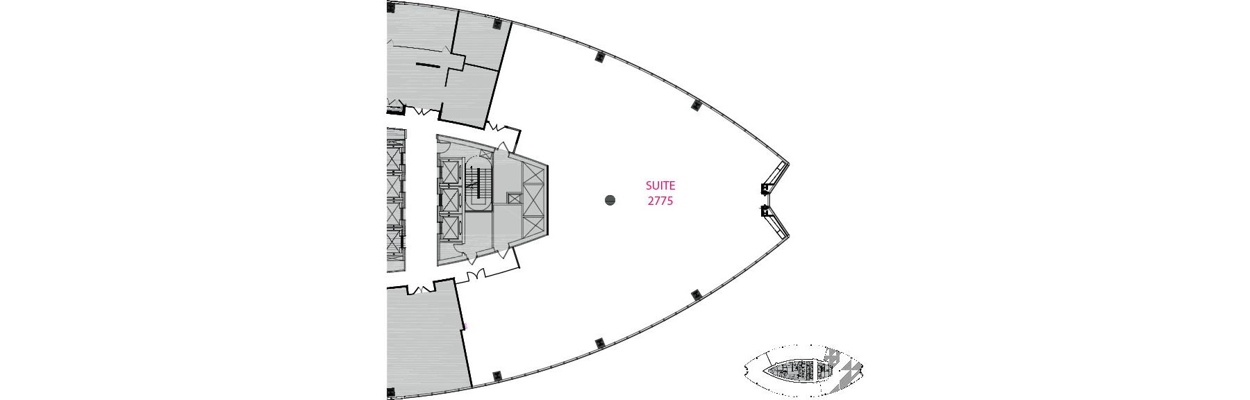 Suite 2775 is a furnished workspace with modern flare, showcasing two walls of floor-to-ceiling windows that frame captivating city views. Enhanced by modern lighting and open ceilings, this open suite is sure to inspire.