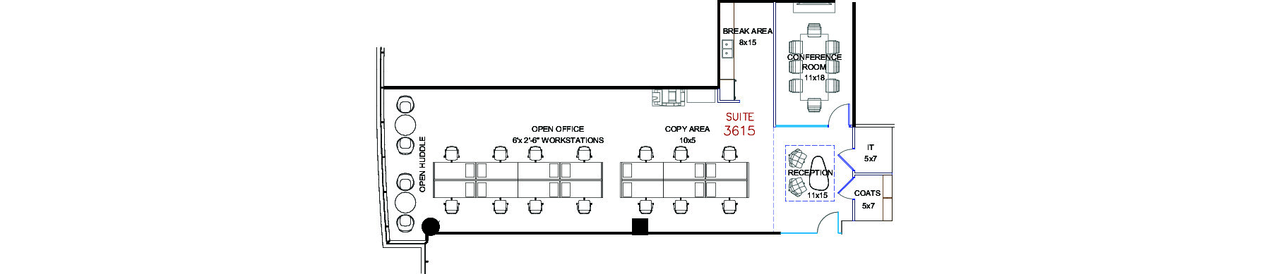 This fully furnished high-rise suite has everything you need — a meeting room, huddle areas, an open workspace with individual work benches, floor-to-ceiling windows offering city views and a break area for collaboration.