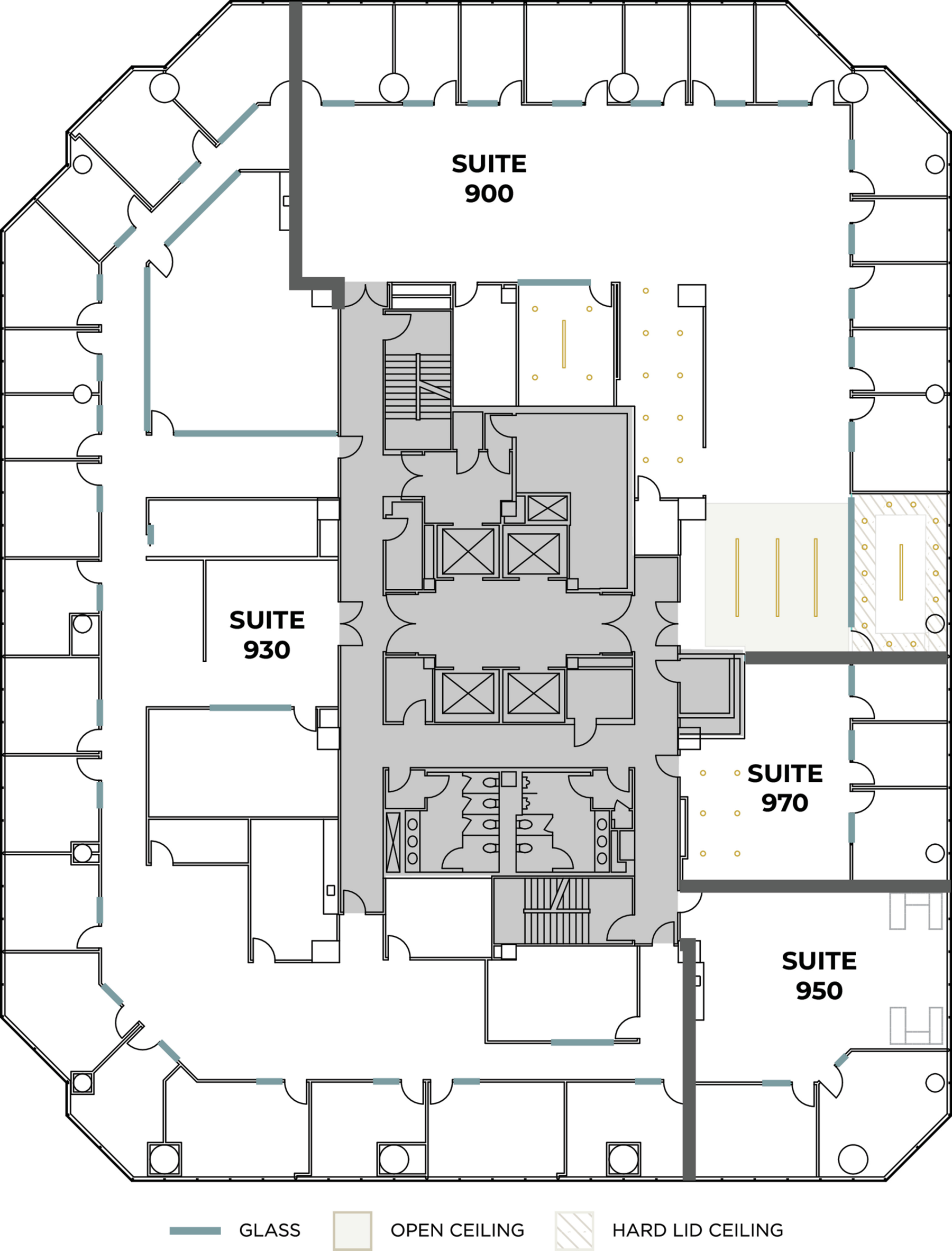 This corner high-rise suite features an open ceiling, specialty lights, floor-to-ceiling windows and space for 40 employees with 12 private offices, two meeting rooms, a break area and flexible open floor space for individual work stations.