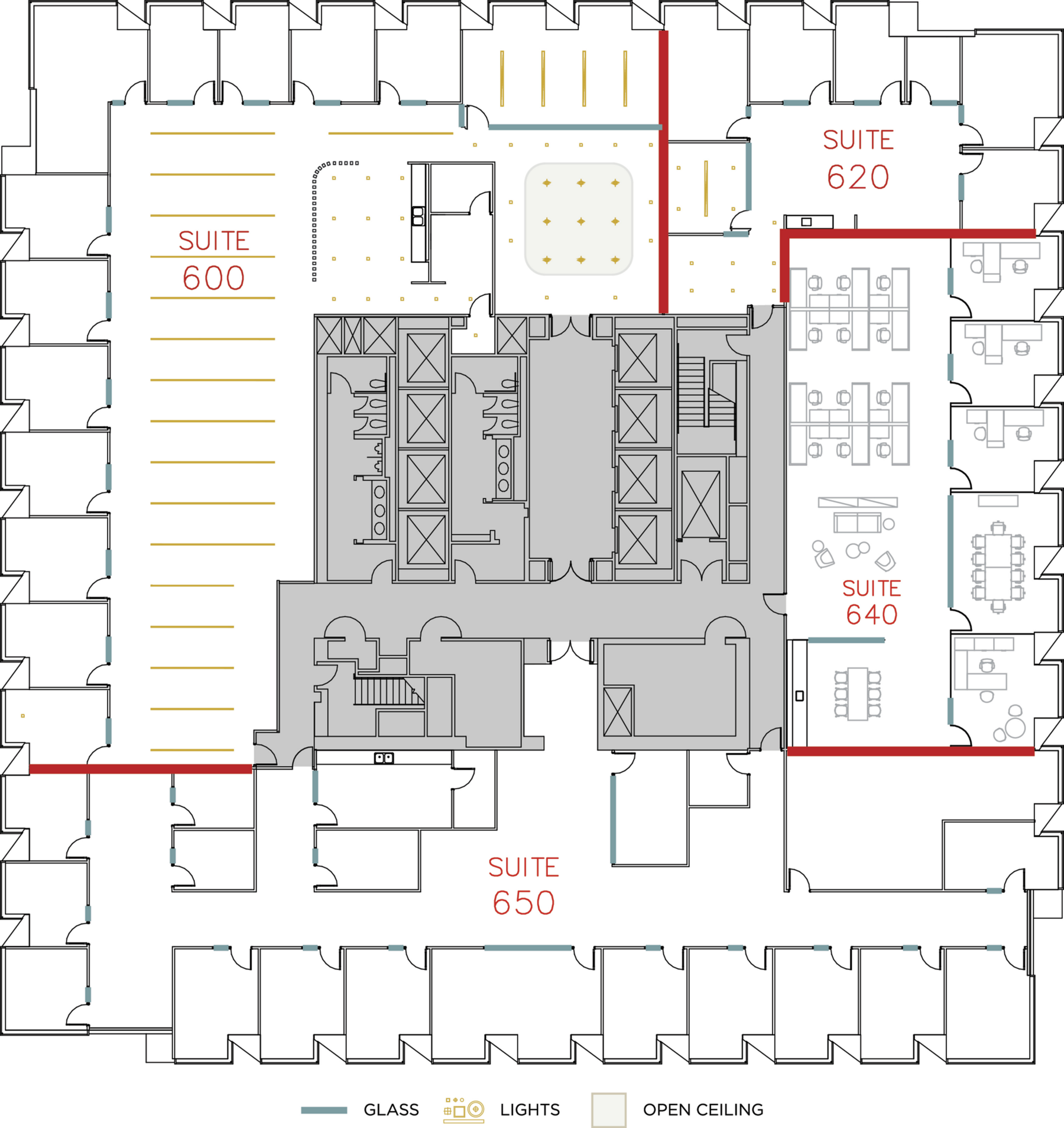 Suite 640 is a fully furnished workspace with floor-to-ceiling windows from perimeter private offices. Your team can access unmatched lifestyle amenities like a private fitness center, on-site dining and outdoor event spaces.
