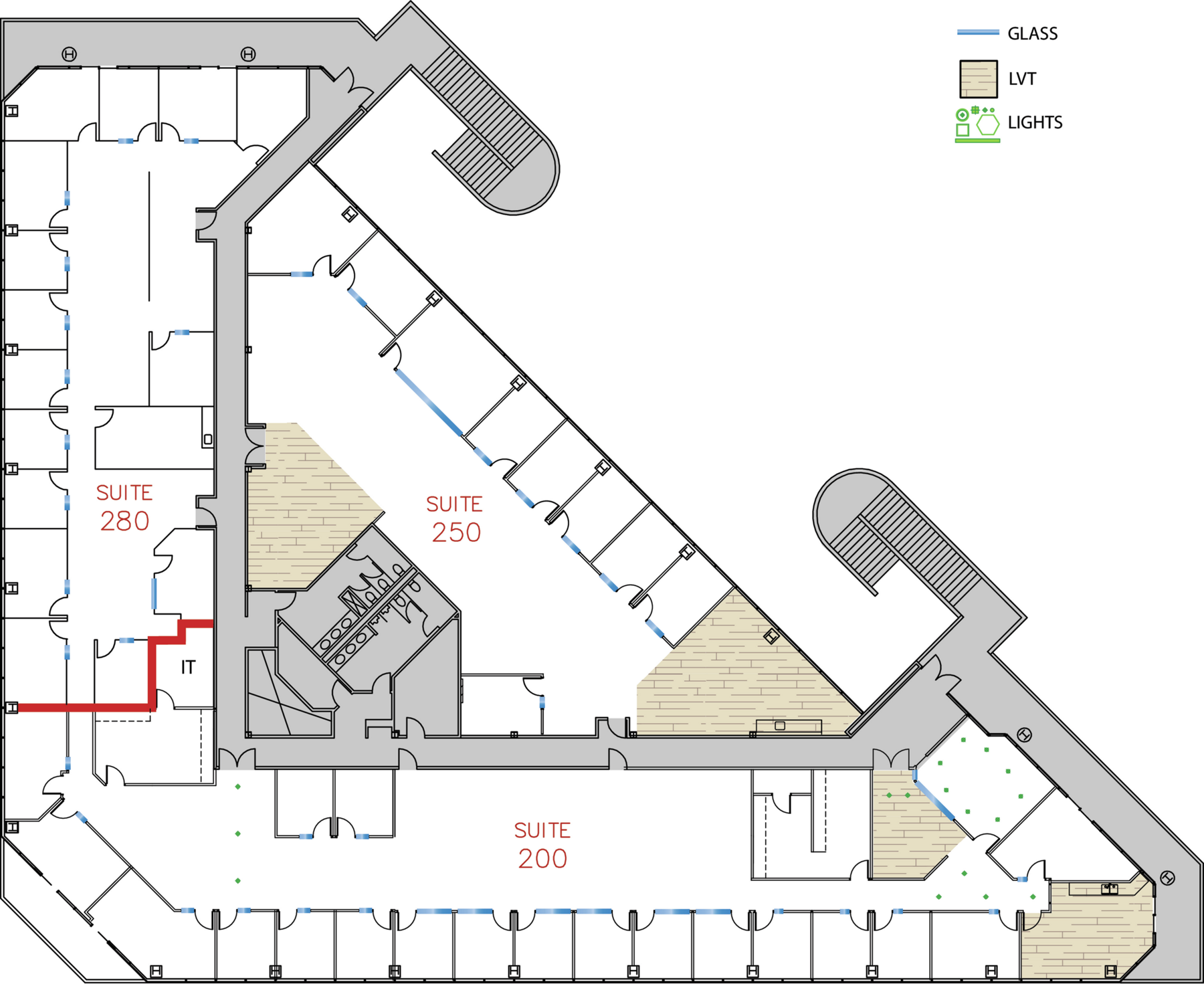 Suite 250 has a mix of perimeter private offices and open space with a large kitchen. Inspire your team in a workplace community with elevated amenities like a resort-style fitness center and outdoor workspaces.