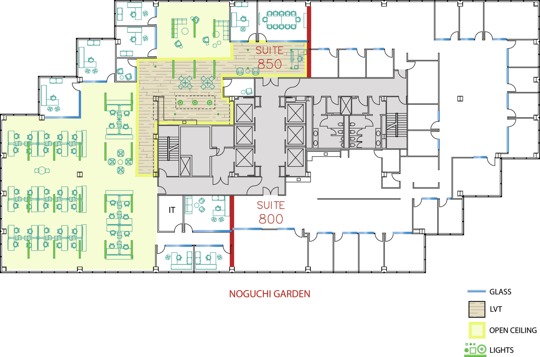 Suite 850 is an open, creative workspace with views of the Noguchi Garden on a vibrant campus in the heart of Costa Mesa’s art district. The suite features a modern design including open ceilings, polished concrete and an open break area.