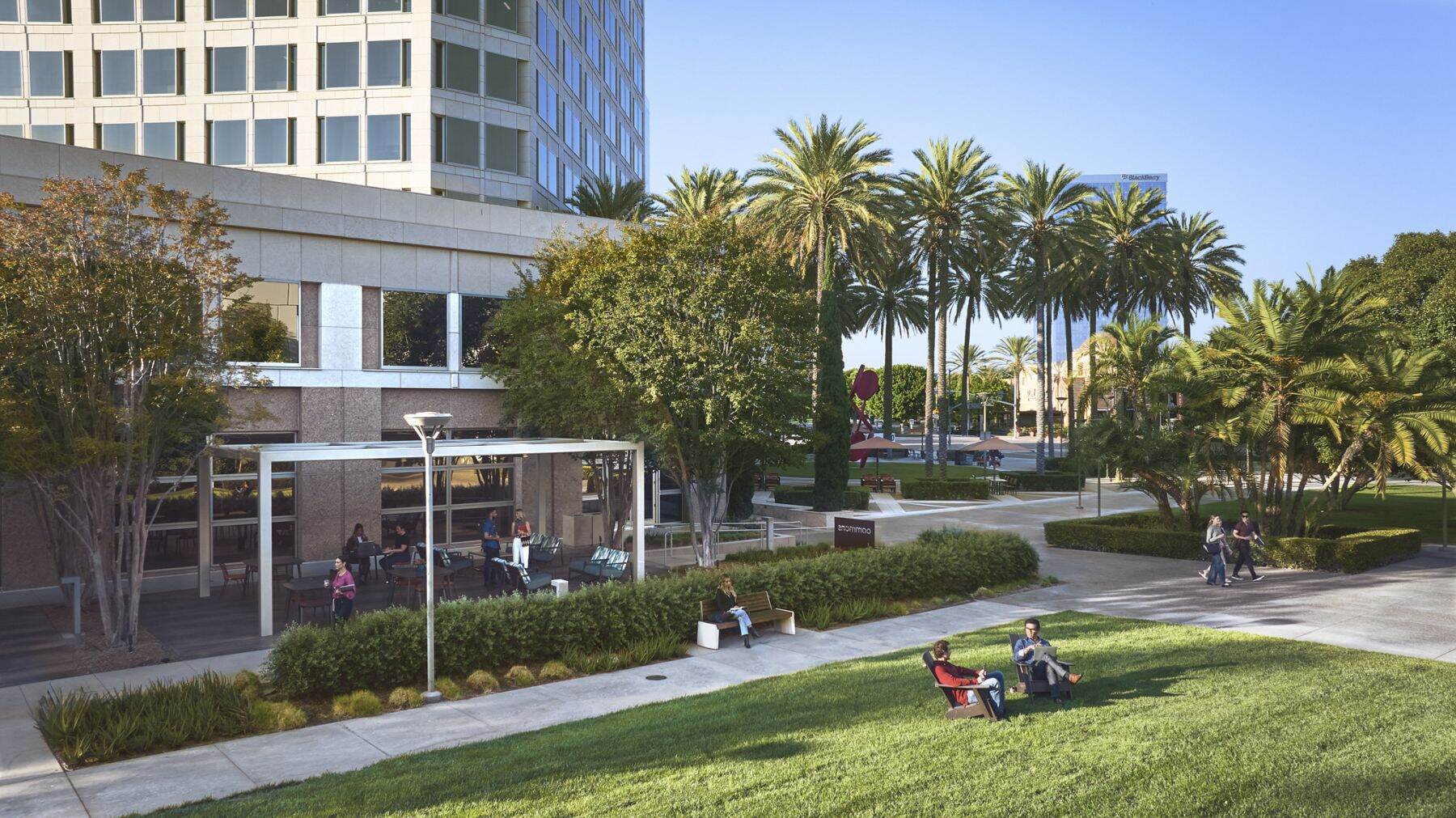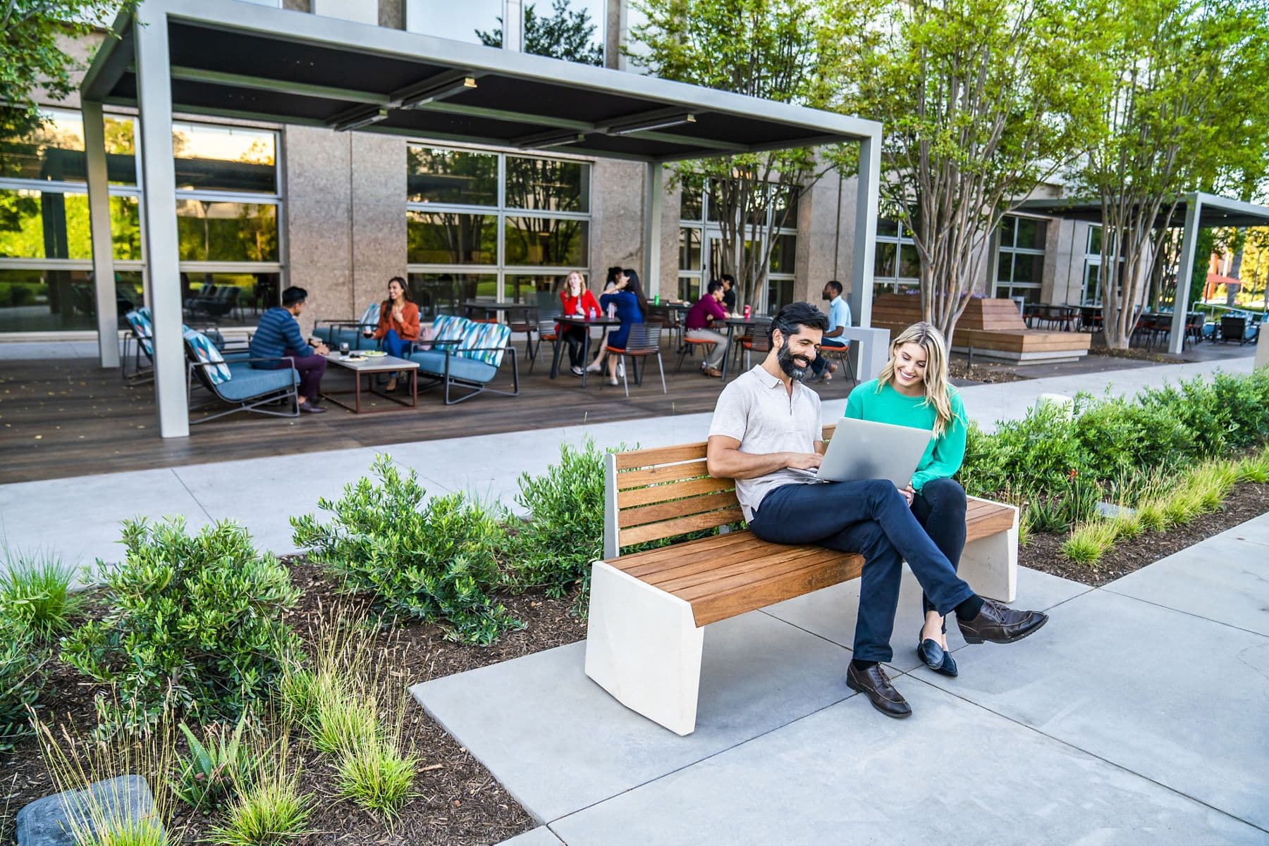 Bring teams and clients together in event-ready outdoor space with shaded seating and lush landscaping.