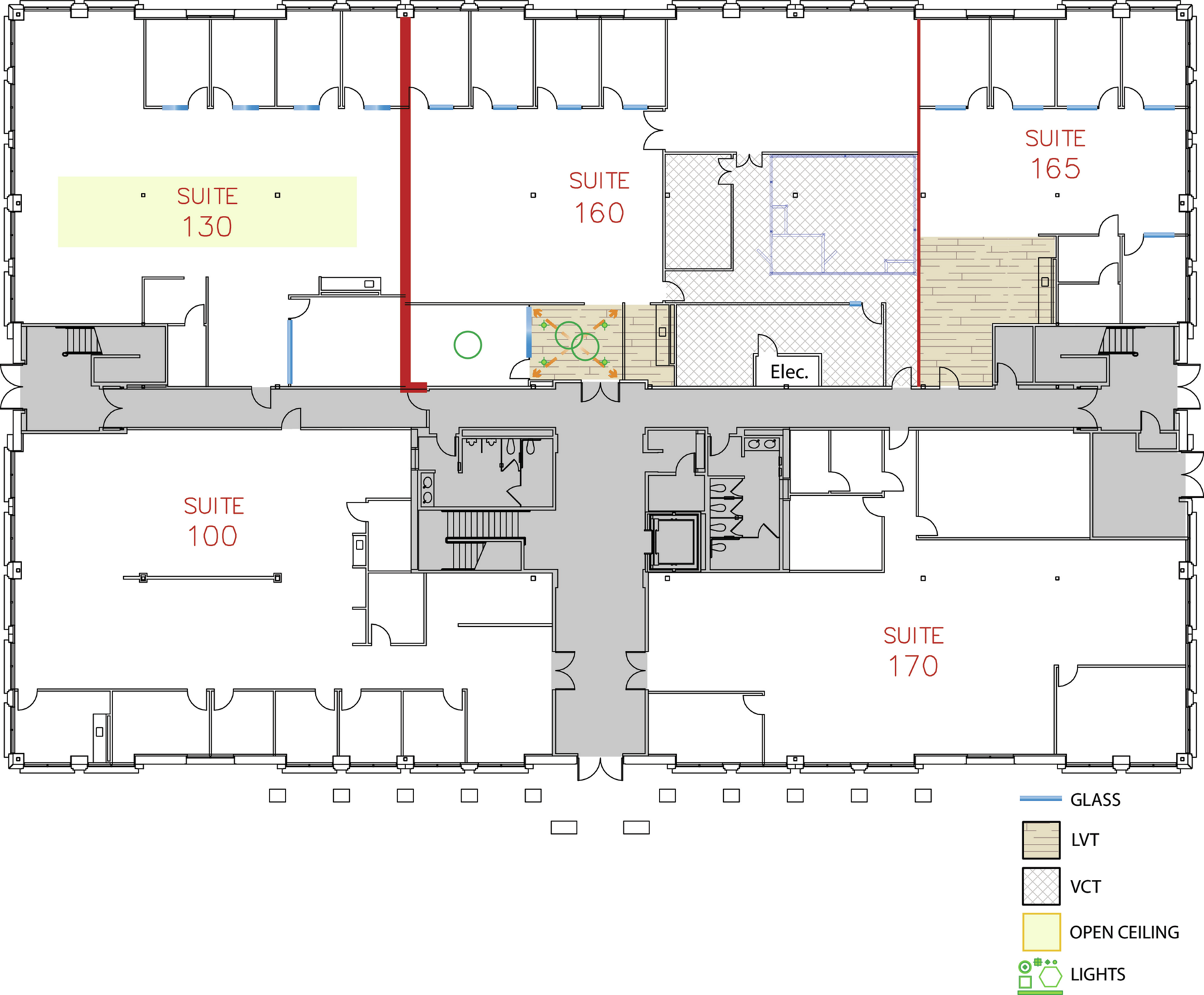 This ground floor corner suite is an ideal space for small and growing teams featuring perimeter private offices and central open workspace with easy access to on-site conveniences.