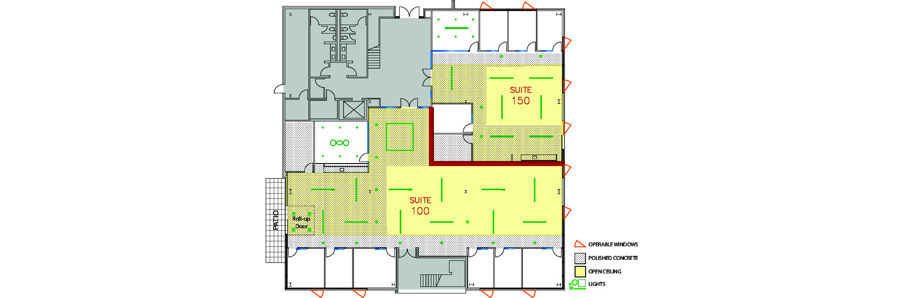 This corner suite is a modern, creative workspace featuring floor-to-ceiling glass with operable windows, an open ceiling and premium finishes with outdoor workspace just outside the door.