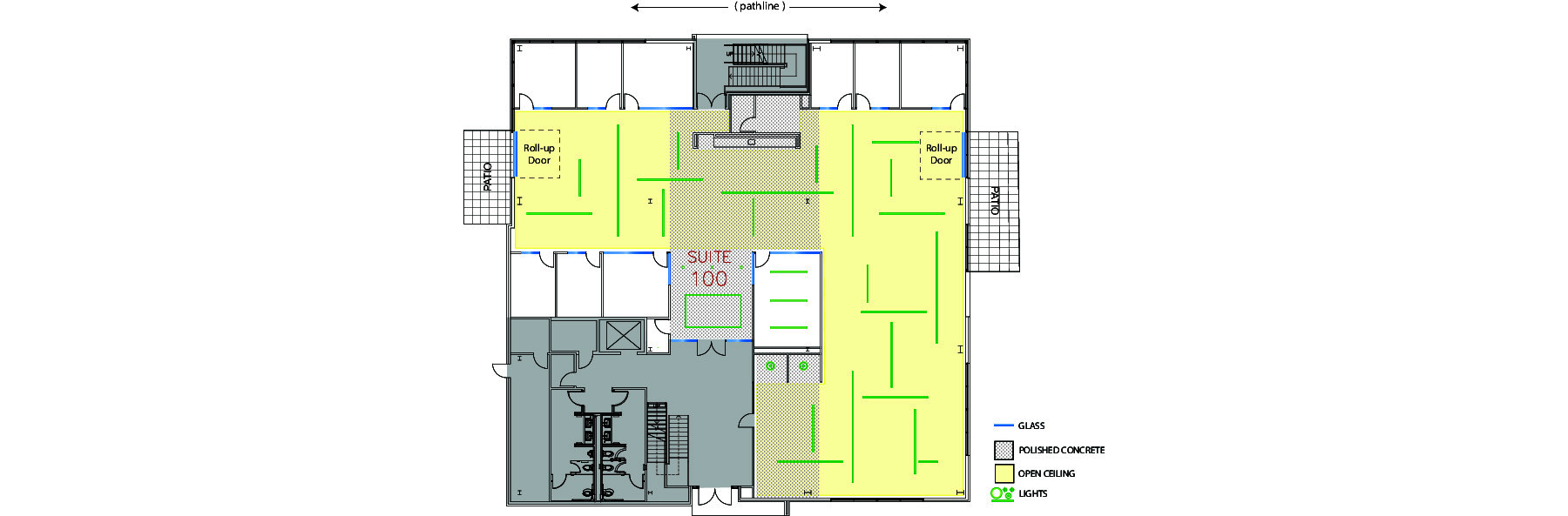 This suite features two private patios accessible via electric roll-up doors, polished concrete floors, an open ceiling and a convenient location steps from a campus-wide pathline connecting to on-campus amenities.