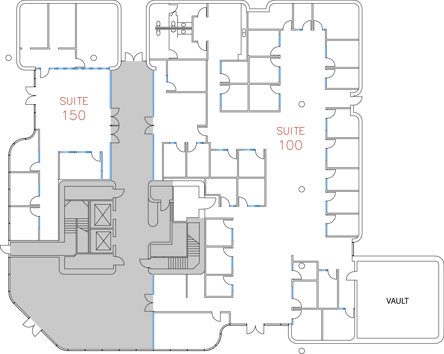 Designed to accommodate teams of 12 to 16, the all new Suite 150 includes premium finishes, specialty lights and an open ceiling, as well as five private offices, a meeting room and flexible open floor space.