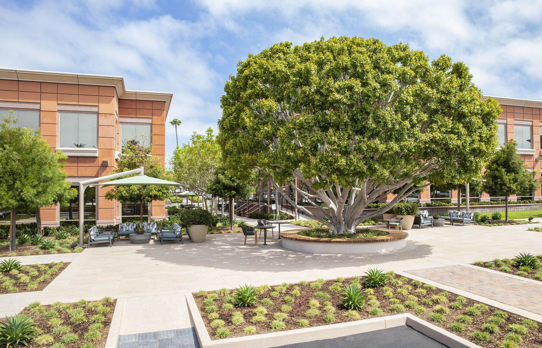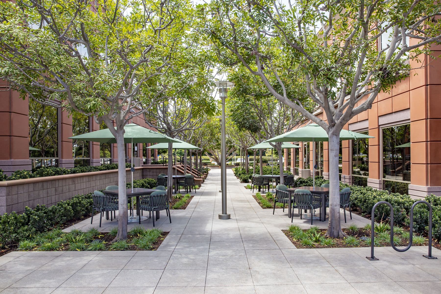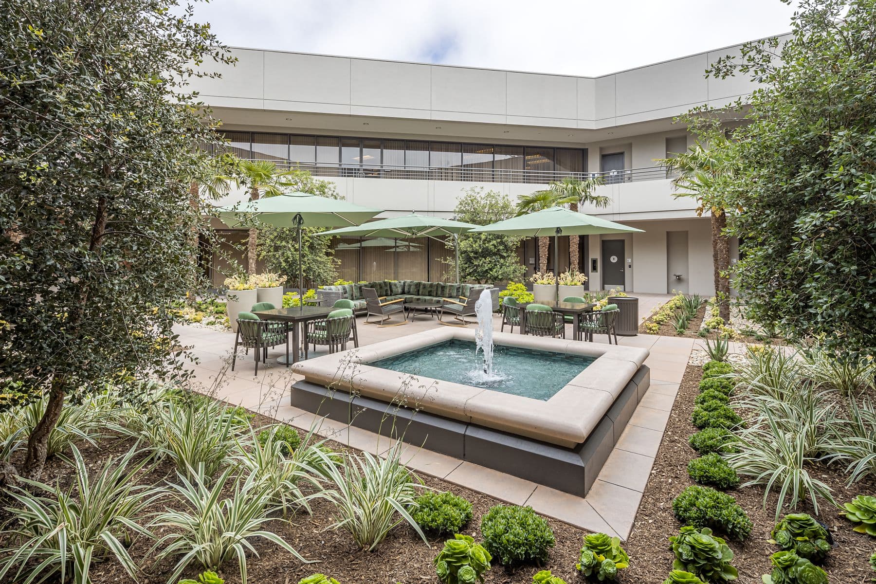 Upgraded outdoor spaces transform Corporate Plaza into a coastal oasis with comfortable outdoor seating, water features and elegant landscaping.