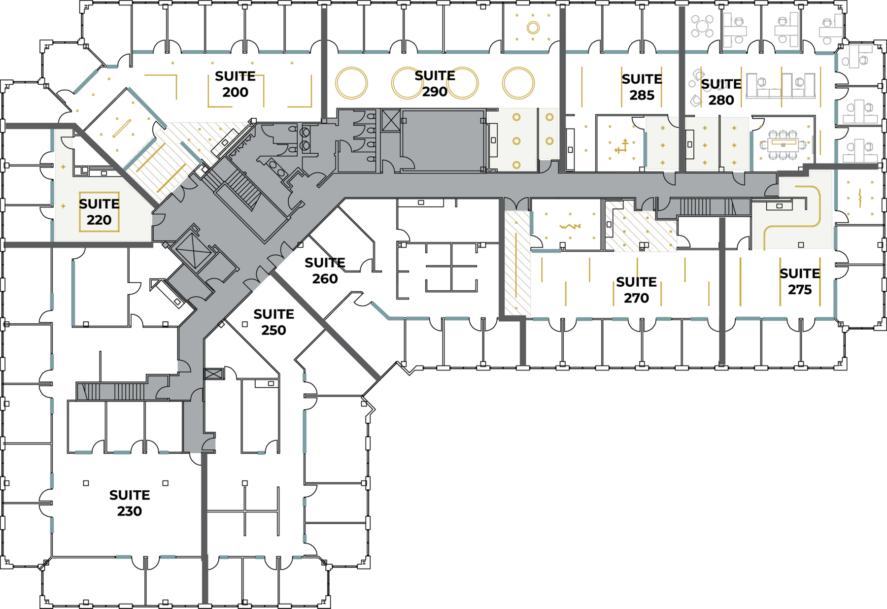 This brand-new corner suite is ideally sized for small teams of up to eight and includes five private offices, a conference room with modern lighting and flexible open floor space for your team’s unique needs.