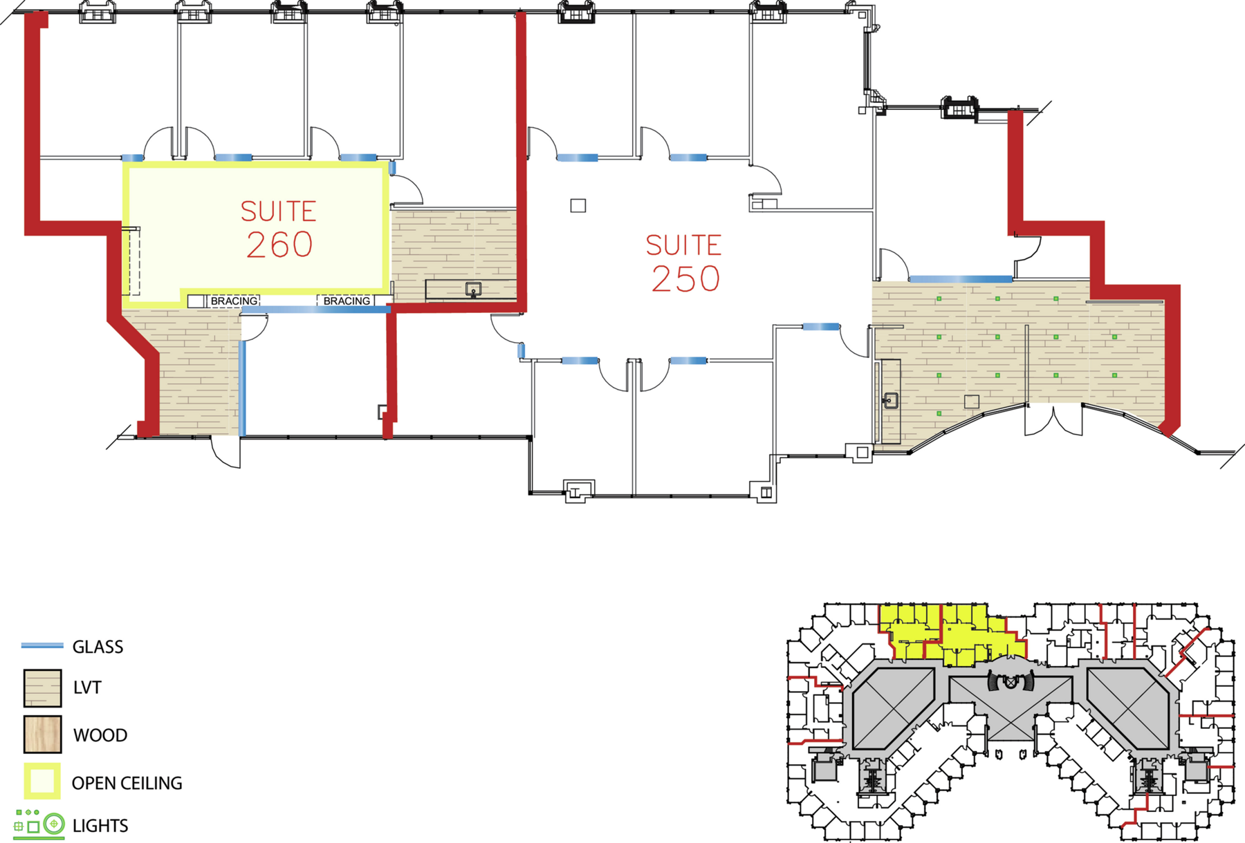Situated in a park-like setting with access to on-site and nearby amenities, Suite 260 is designed to accommodate 10 to 12 employees and has four private offices, a meeting room, a break area and flexible open floor space plus modern design including an open ceiling.