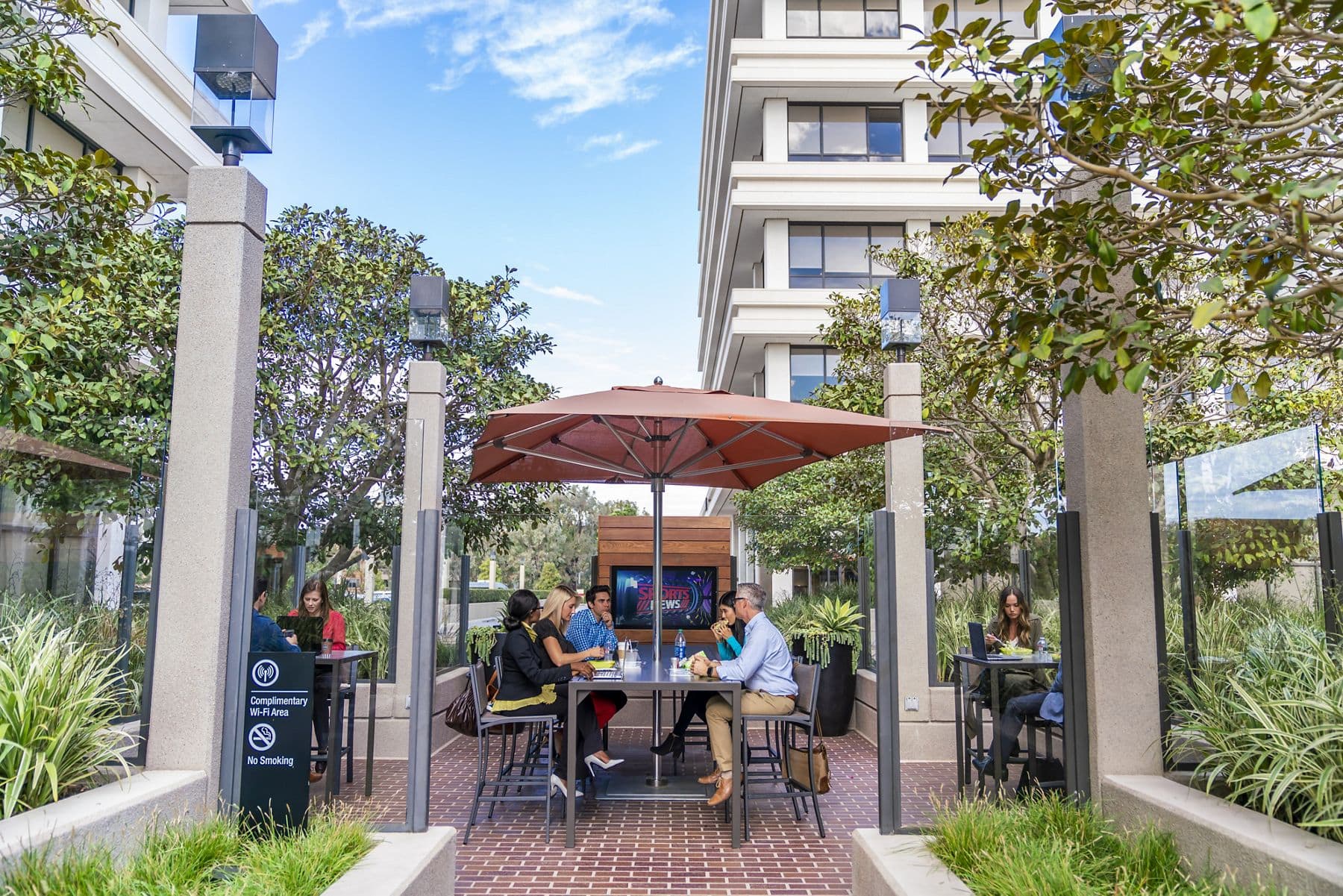 Elevate the workday in 287K SF of premium workspace surrounding a WiFi-connected pedestrian plaza with walkable luxury apartments next door at Colony at Fashion Island.