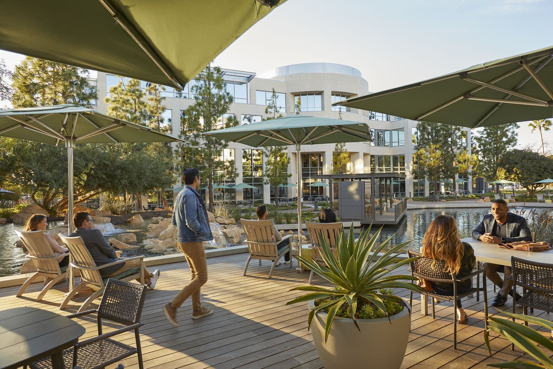 Spark creativity and connection in relaxing outdoor workspaces, including an amphitheater and a cafe suspended over a central pond.