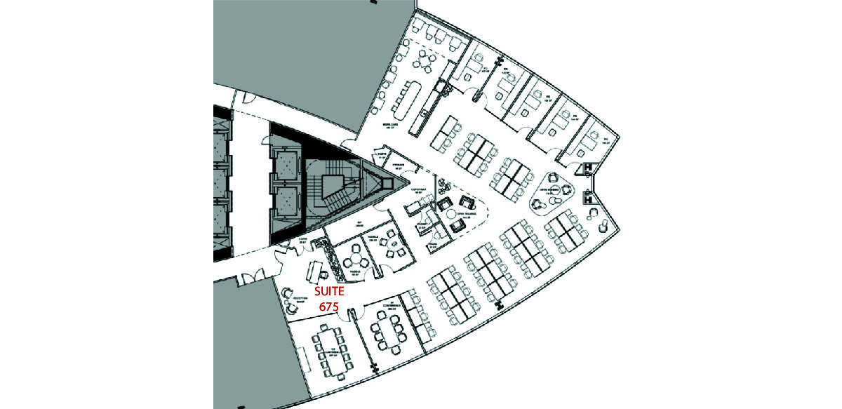 Discover Suite 675, a corner workspace framed by expansive windows. Featuring contemporary conference rooms and a modern kitchen, this space seamlessly blends private offices with open work areas for the perfect business environment.