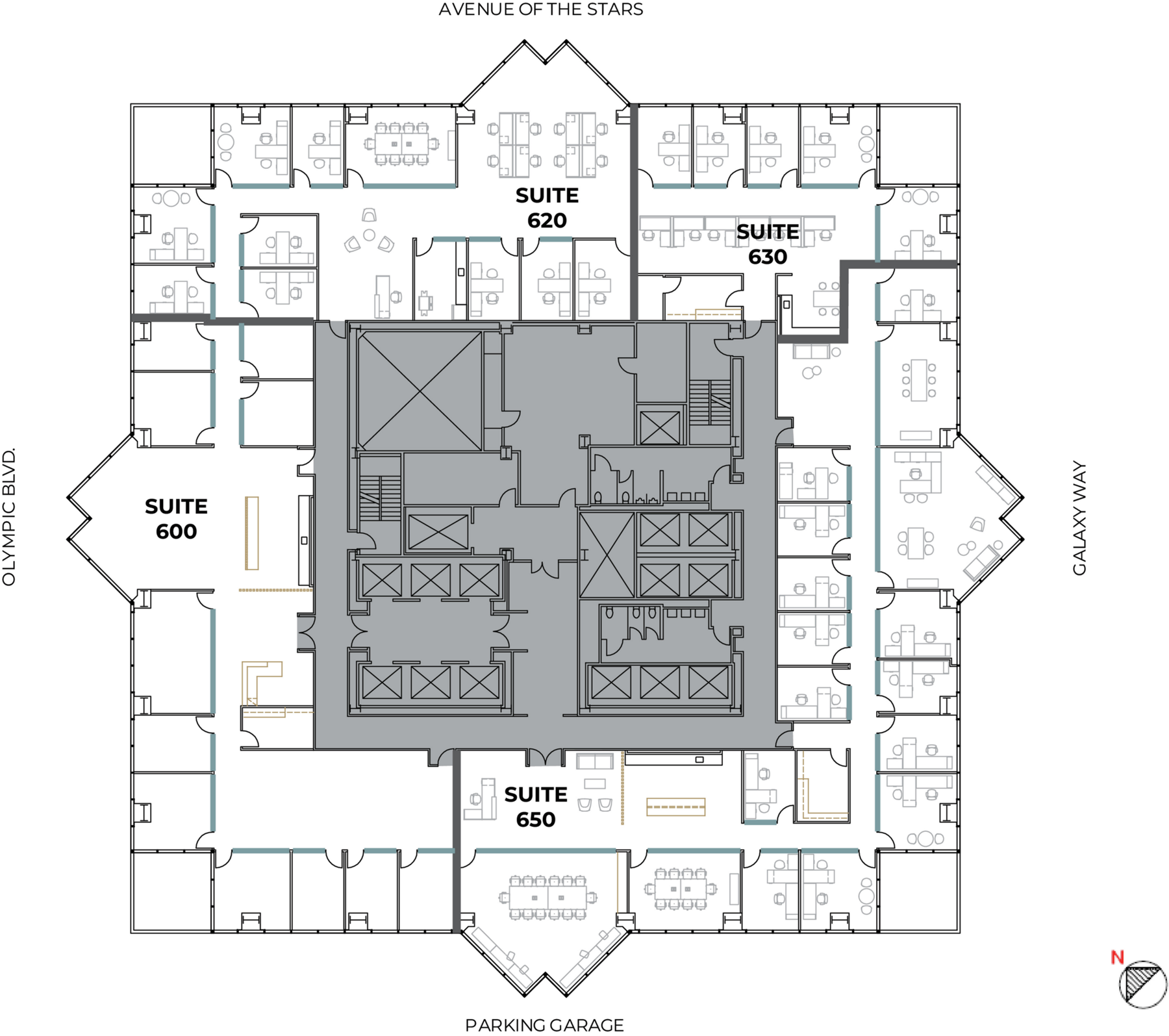 Suite 620 offers a furnished corner space with sweeping views, blending private office and bench workstations. Design features include open ceilings, polished concrete floors, modern lighting and a large enclosed kitchen.