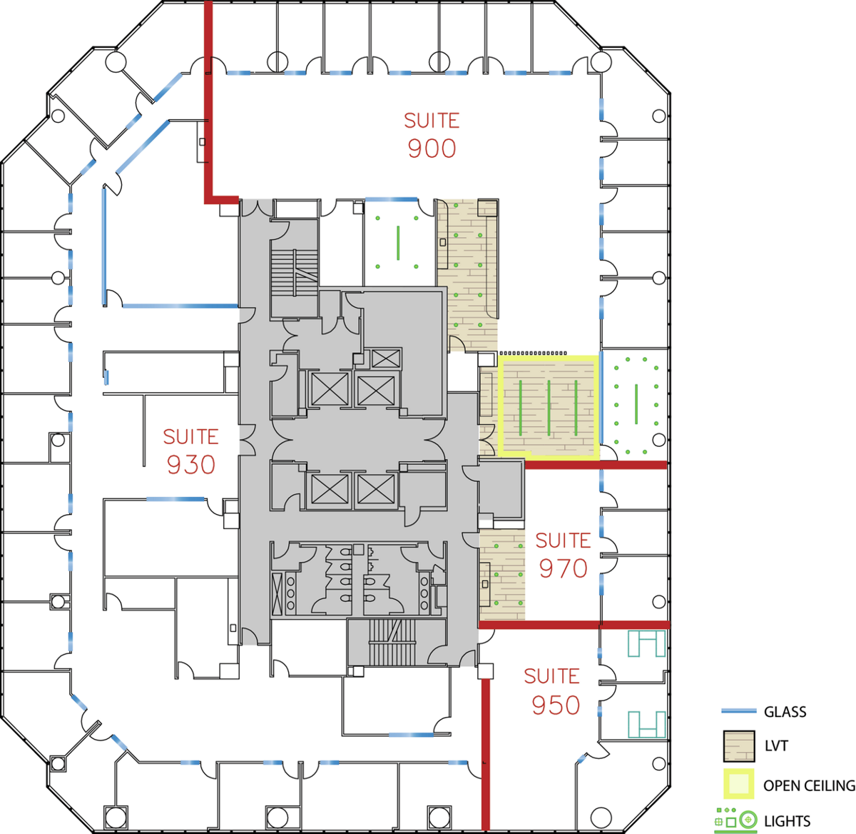 This corner high-rise suite features an open ceiling, specialty lights, floor-to-ceiling windows and space for 40 employees with 12 private offices, two meeting rooms, a break area and flexible open floor space for individual work stations.