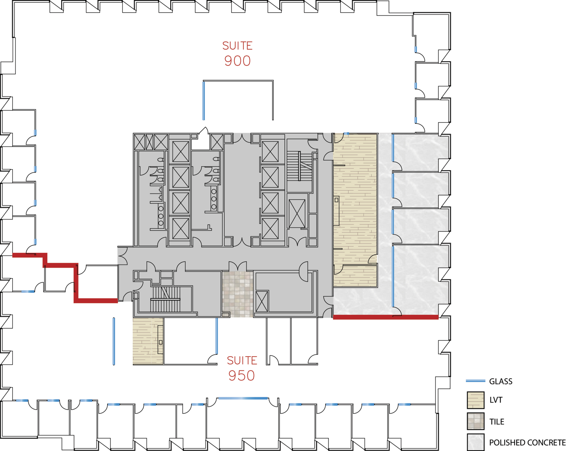 Designed to accommodate medium-sized businesses, Suite 950 brings together perimeter private offices, flexible open workspace and inviting collaboration areas in one modern high-rise.