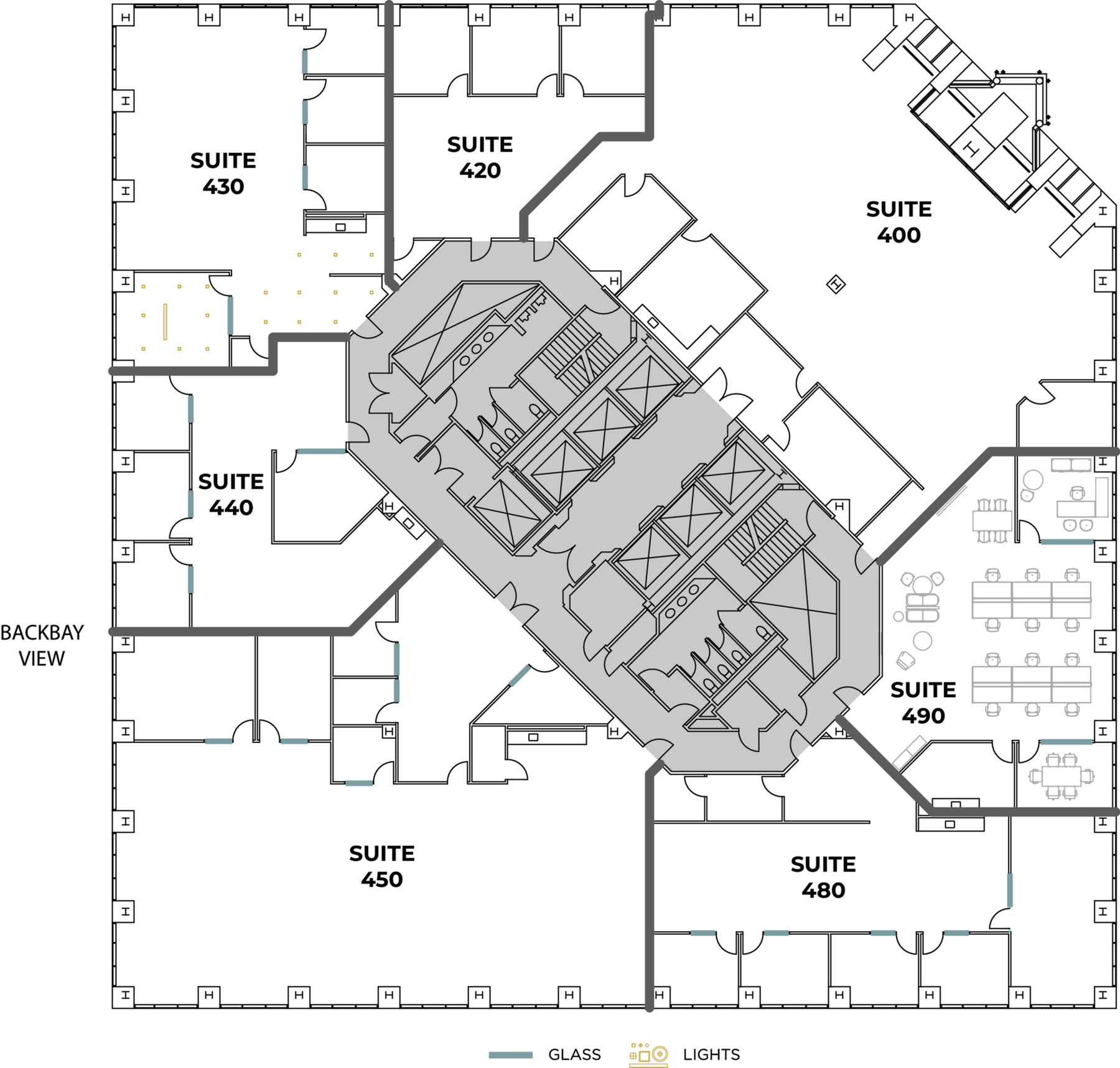 This all new corner suite has ample room for 12 to 14 employees with three private offices, a meeting room, flexible open floor space and a break area. Noteworthy features include modern lights, floor-to-ceiling windows and glass doors throughout.