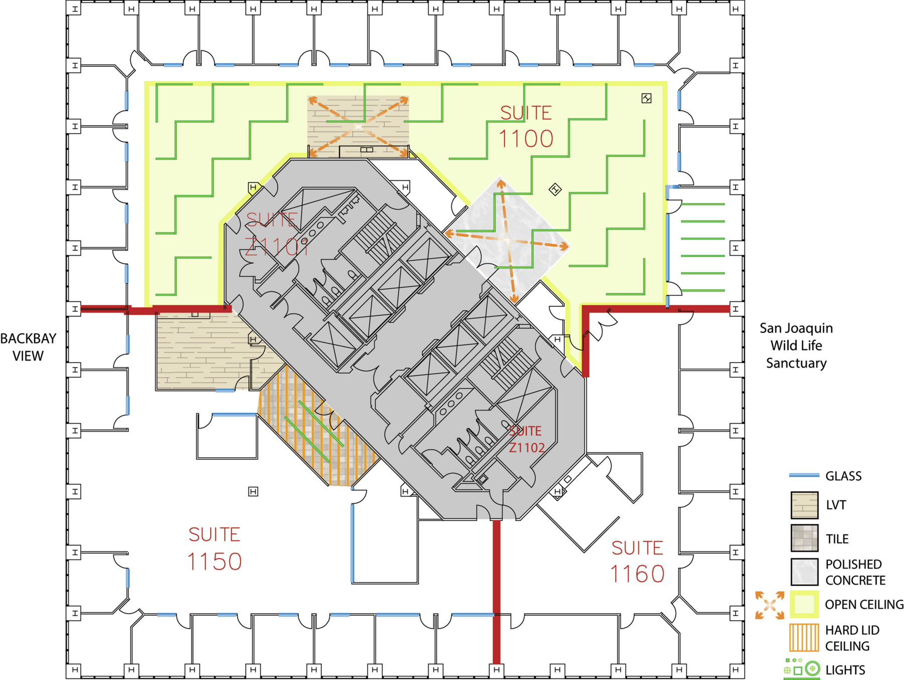 Suite 1100 features sweeping views of Newport Back Bay, open ceilings, plus modern finishes and lighting throughout. Part of a prestigious 12-acre campus, this half-floor workspace gives teams access to a wealth of on-site amenities.