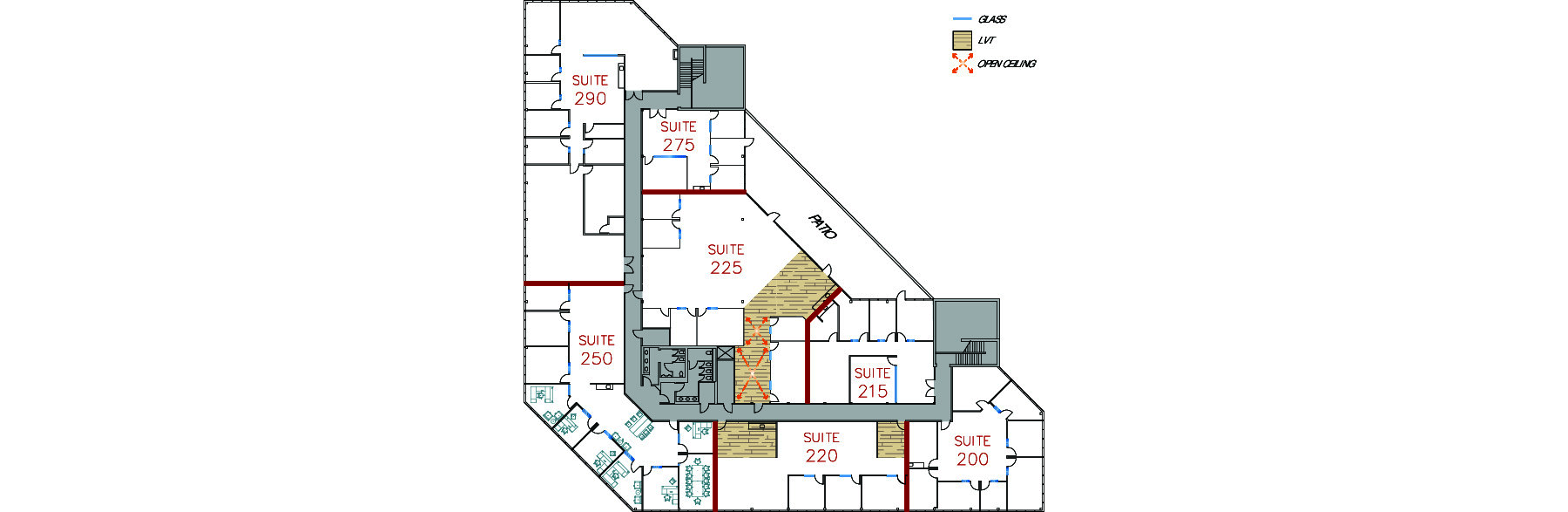 The ideal space for a small team, Suite 220 offers two private offices, dedicated meeting room, space for 10 open workstations and a collaboration area for ultimate productivity.