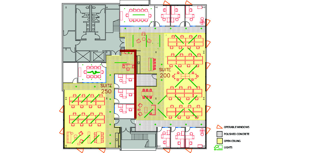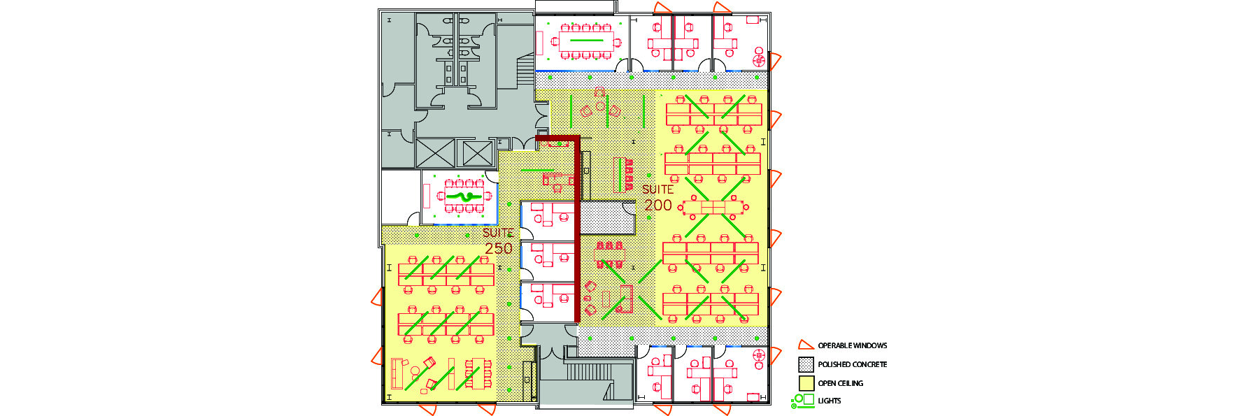 This fully furnished creative suite features ample open workspace, operable windows, exposed ceiling, a large collaborative break area with building supergraphic signage opportunity.