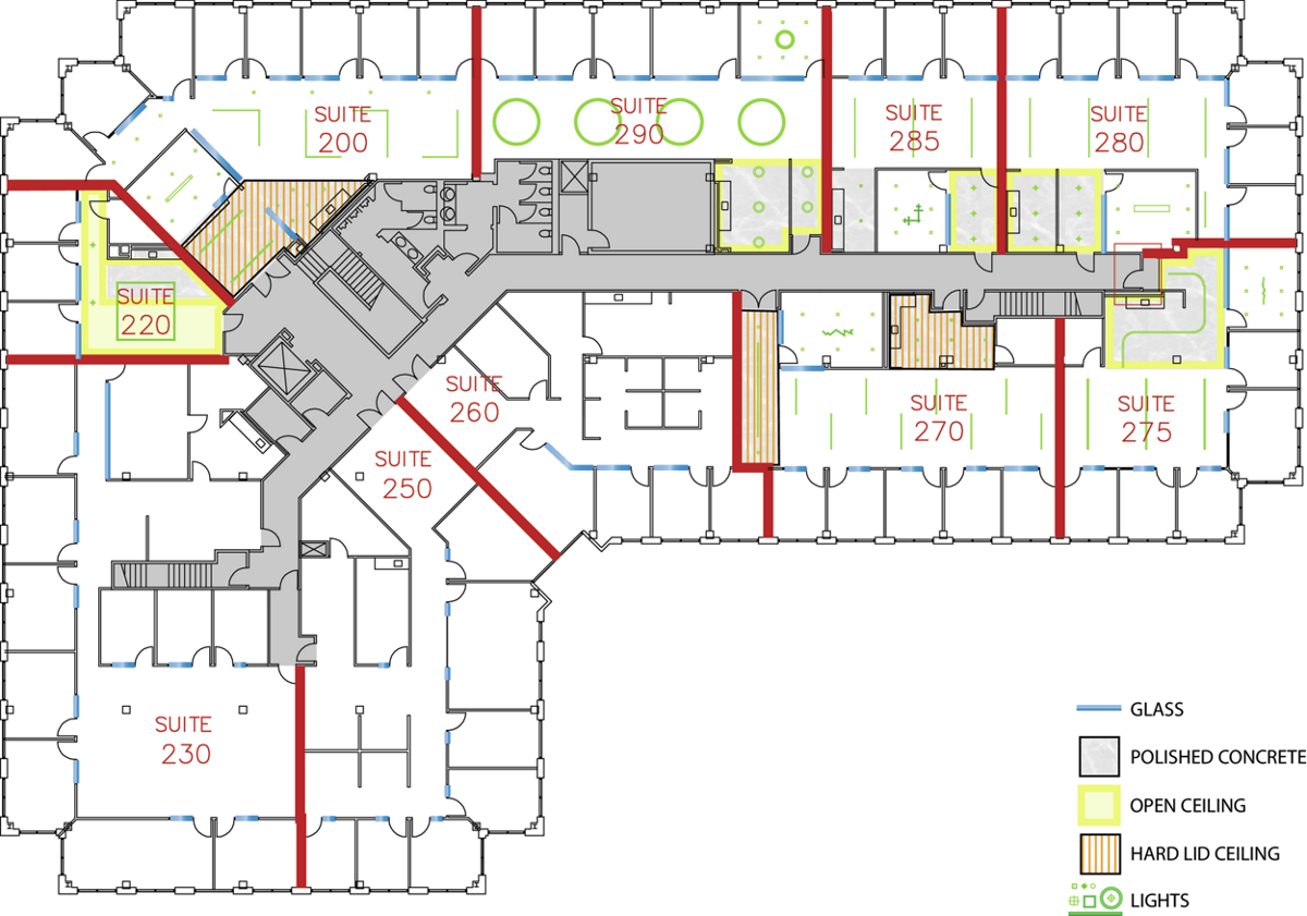 This corner suite features an elegant sandstone exterior, sleek oversized windows, modern lighting and an all-new interior. The space easily accommodates teams of up to 12 with 7 private offices, a conference room and flexible open floor space.